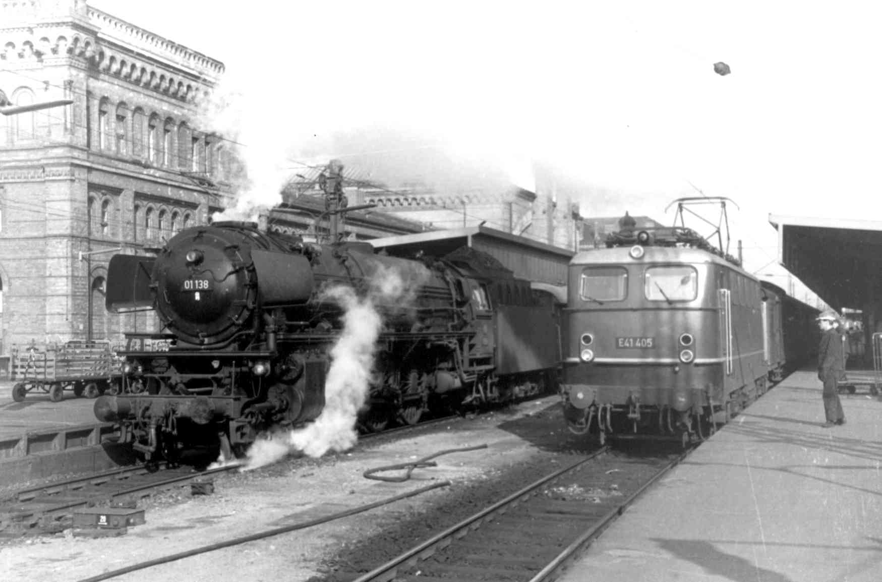 01 138 bei der Ausfahrt vor dem Hannoveraner Empfangsgebäude. Der Kohlenberg auf dem Tender