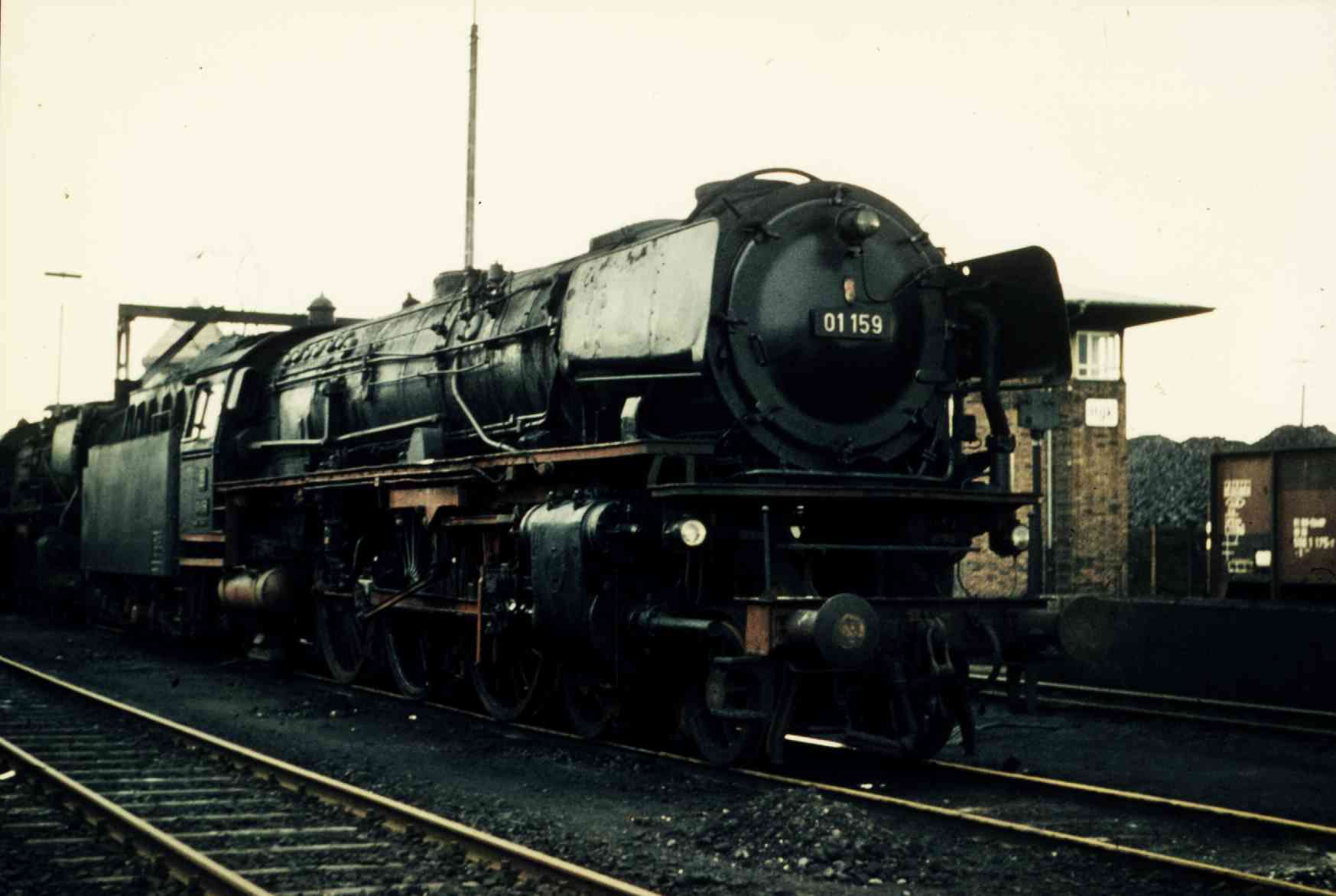 01 159 abgestellt im Bw Hannover Hbf. Das Stellwerk am rechten Bildrand trägt die Bezeichnung Hgk (Hagenkamp).