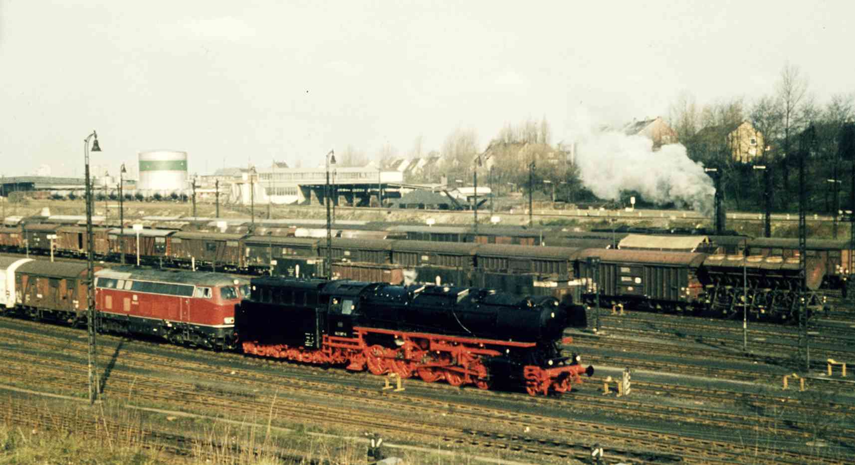 043 087-6 vor einer Lok der Baureihe 216 kurz vor der Abfahrt aus
