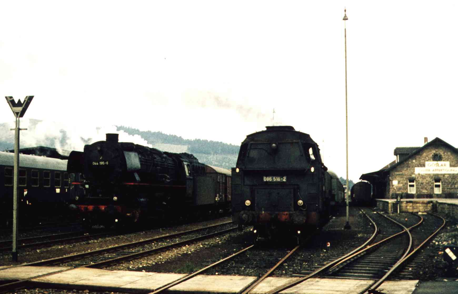 044 195-6 in Goslar vor einem Güterzug auf Ausfahrt wartend, um 1968/1969.
