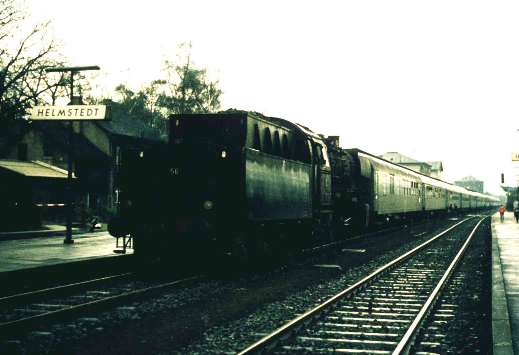 50 919 an einem regnerischen Tag in Helmstedt auf Gleis 1. Um 1967/1968.