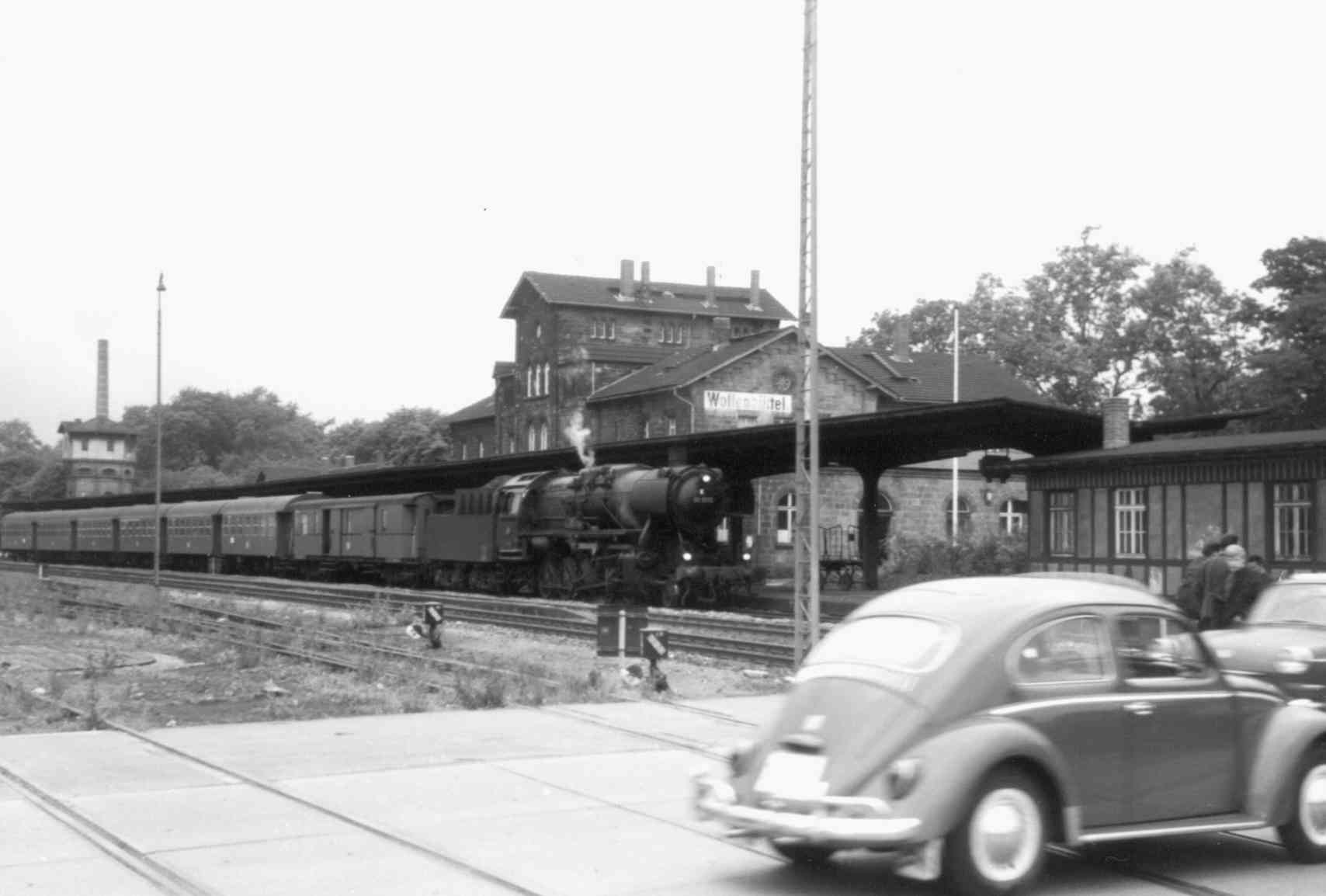50 1072 vor Personenzug in Wolfenbüttel beim Halt, um 1966/1967.
