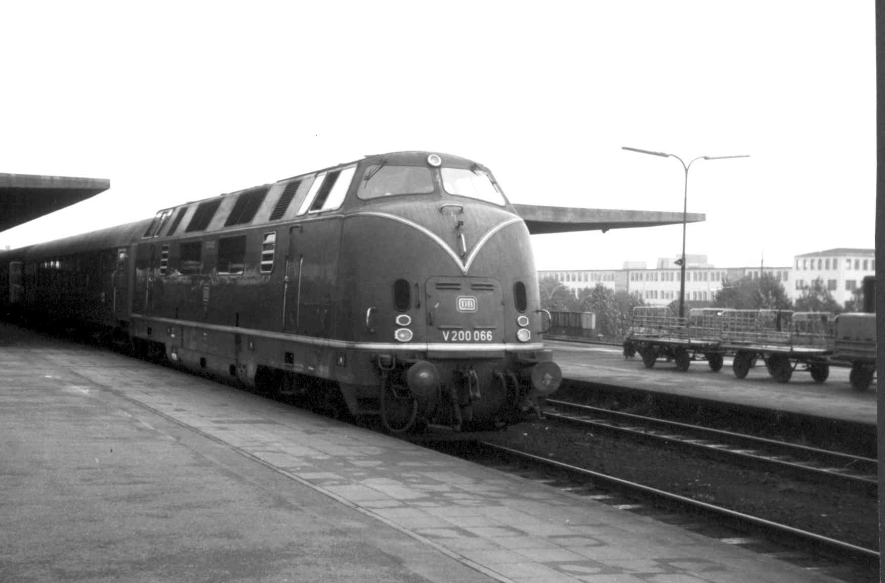 V200 066 auf Gleis 6 im Braunschweiger Hbf vor einem Reisezug Richtung Westen. Um 1967/1968.