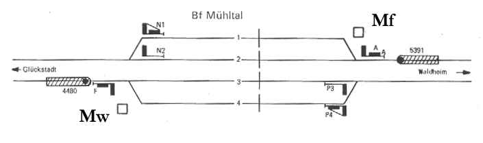 Aus folgender Tabelle sind am Beispiel des Bahnhofs Mühltal alle Bahnhofsblockfelder aufgeführt, die für Zugfahrten in, aus oder durch den Bahnhof bedient werden müssen. Mitarbeitende Felder sind eingeklammert und werden durch Bedienen des zugehörigen Bahnhofsblockfeldes verwandelt; sie ermöglichen danach die Bedienung des jeweils darunter aufgeführten Bahnhofsblockfeldes.