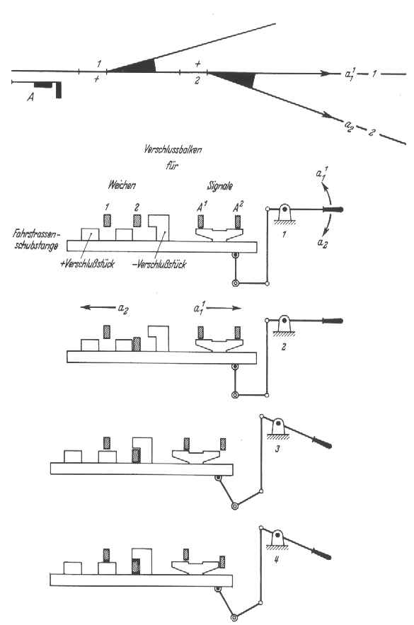 Auf der das Hauptsignal bedienenden Stelle wird die (nach rechts oder links verschobene Fahrstraßenschubstange durch Umlegen des Signalhebels verschlossen.