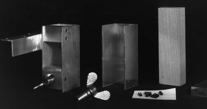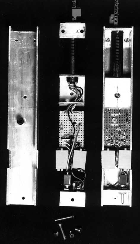 Hier ist ein Schacht für flache Modulkästen zu sehen. Von links nach rechts: Schacht mit Haltewinkel, Signalträger, Füllstück für unbenutzte Schächte.